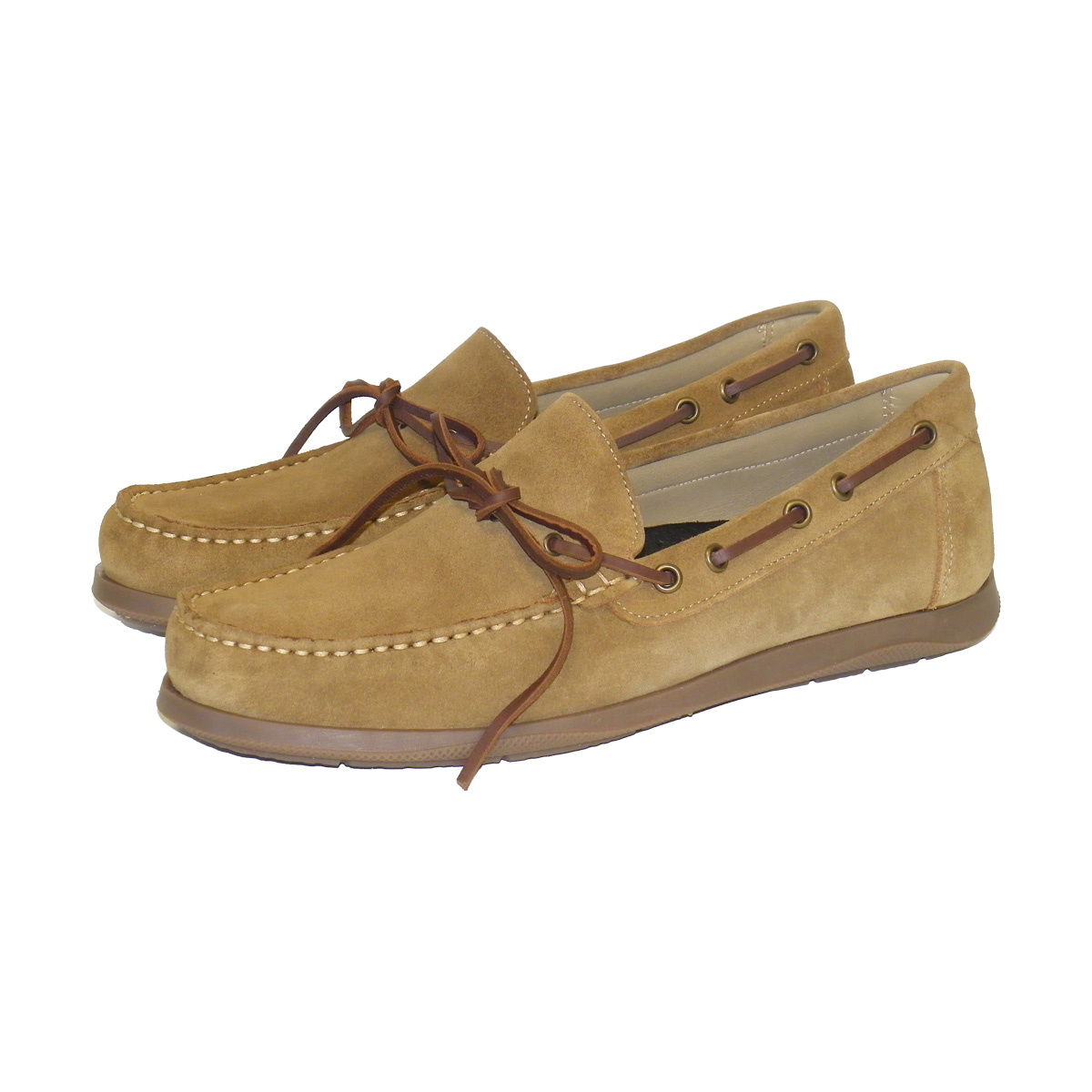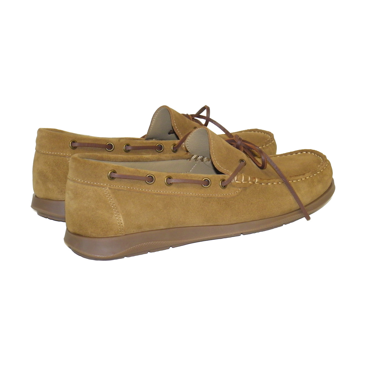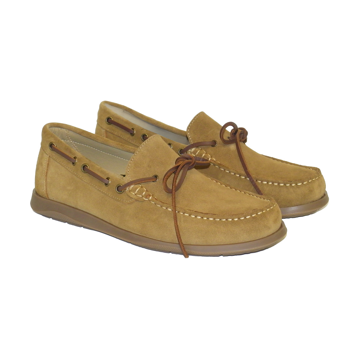 Zapato de hombre, tipo mocasin con antifaz, fabricado en piel afelpado de color marron claro y suela en caucho caramelo.