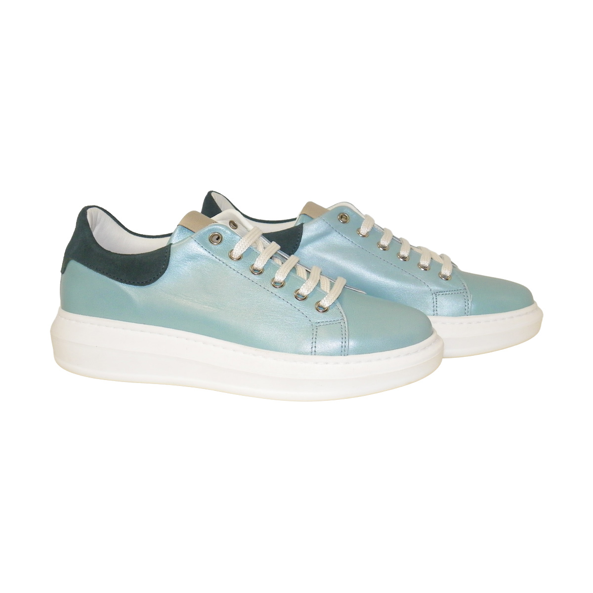 Zapato sport en color turquesa. Fabricado en piel nacarada turquesa. Forro micro absorvente y trasnpirable color blanco, plantilla extraible forrada de micro absorvente y traspirable. Suela de caucho ligero color blanco.