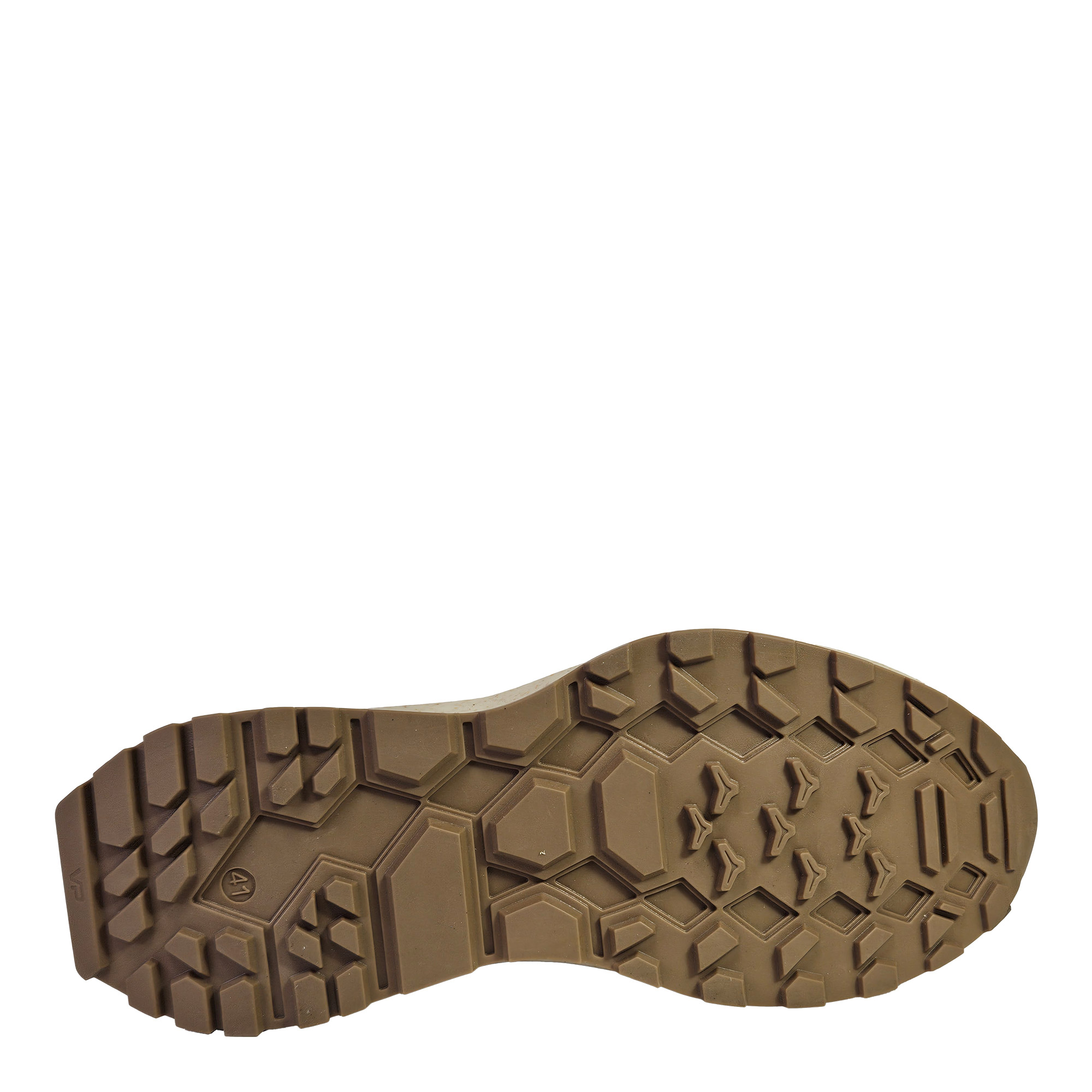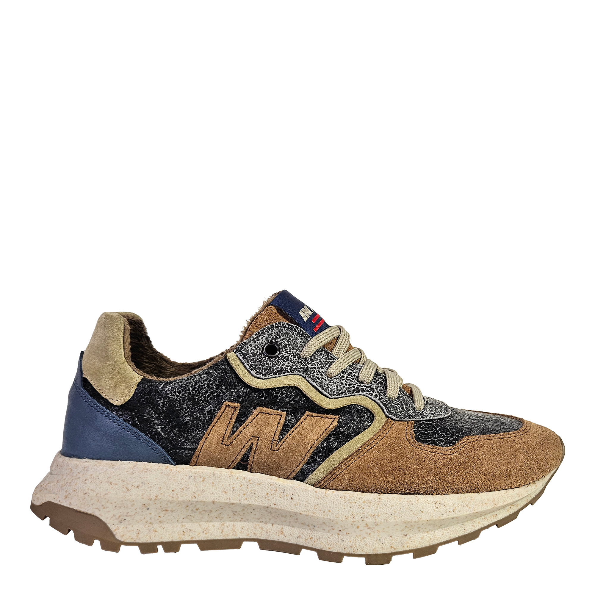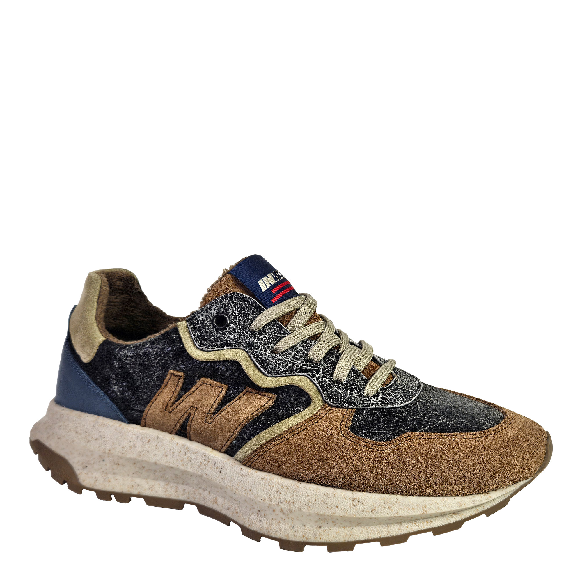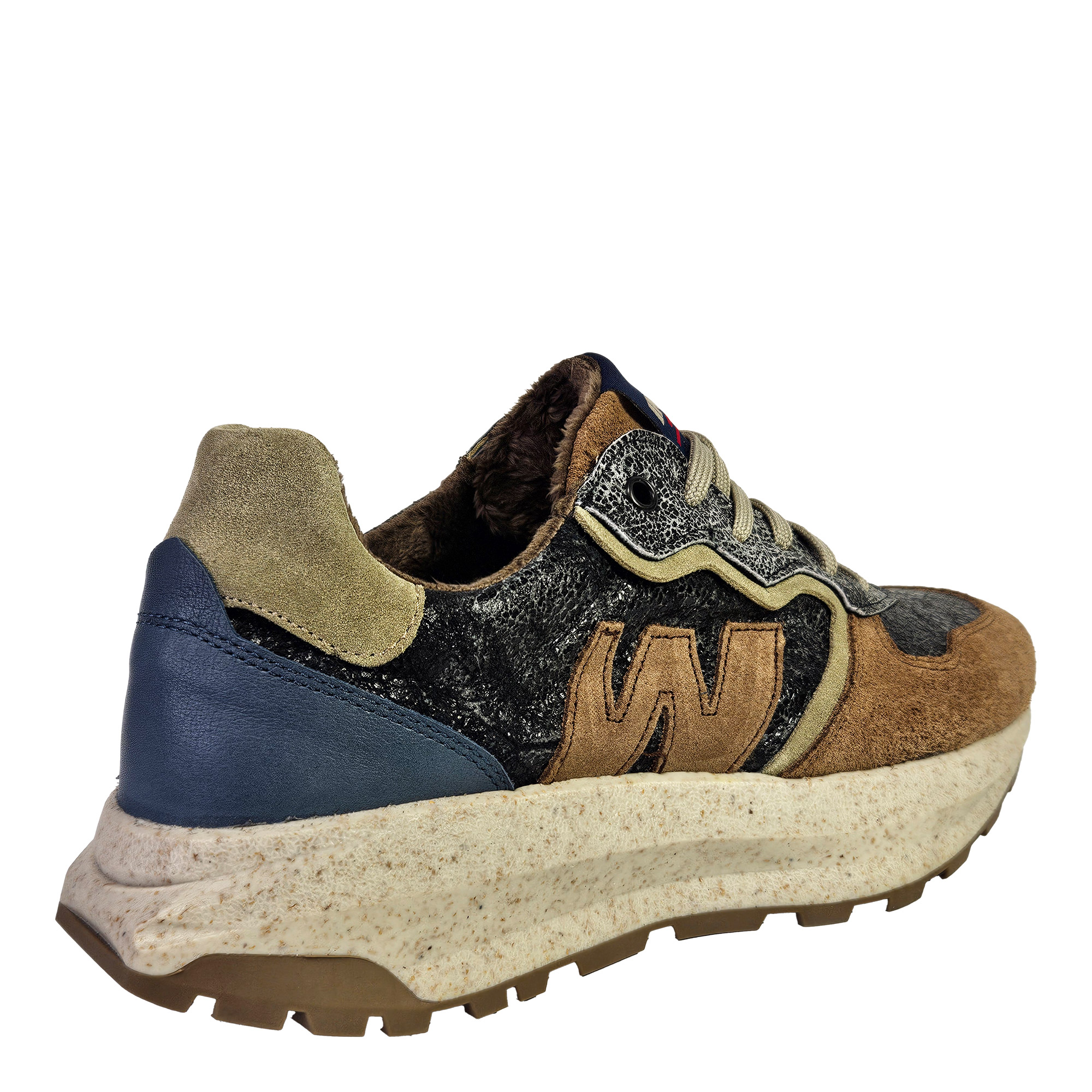 Sneaker de caballero, fabricado con una combinación de pieles con acabado afelpado y serraje con acabado irregular. Colores camel, negro, verde y marino. El forro es de tejido con pelo de color marrrón. La suela es de caucho TR Light en colores marrones y beige combinados.