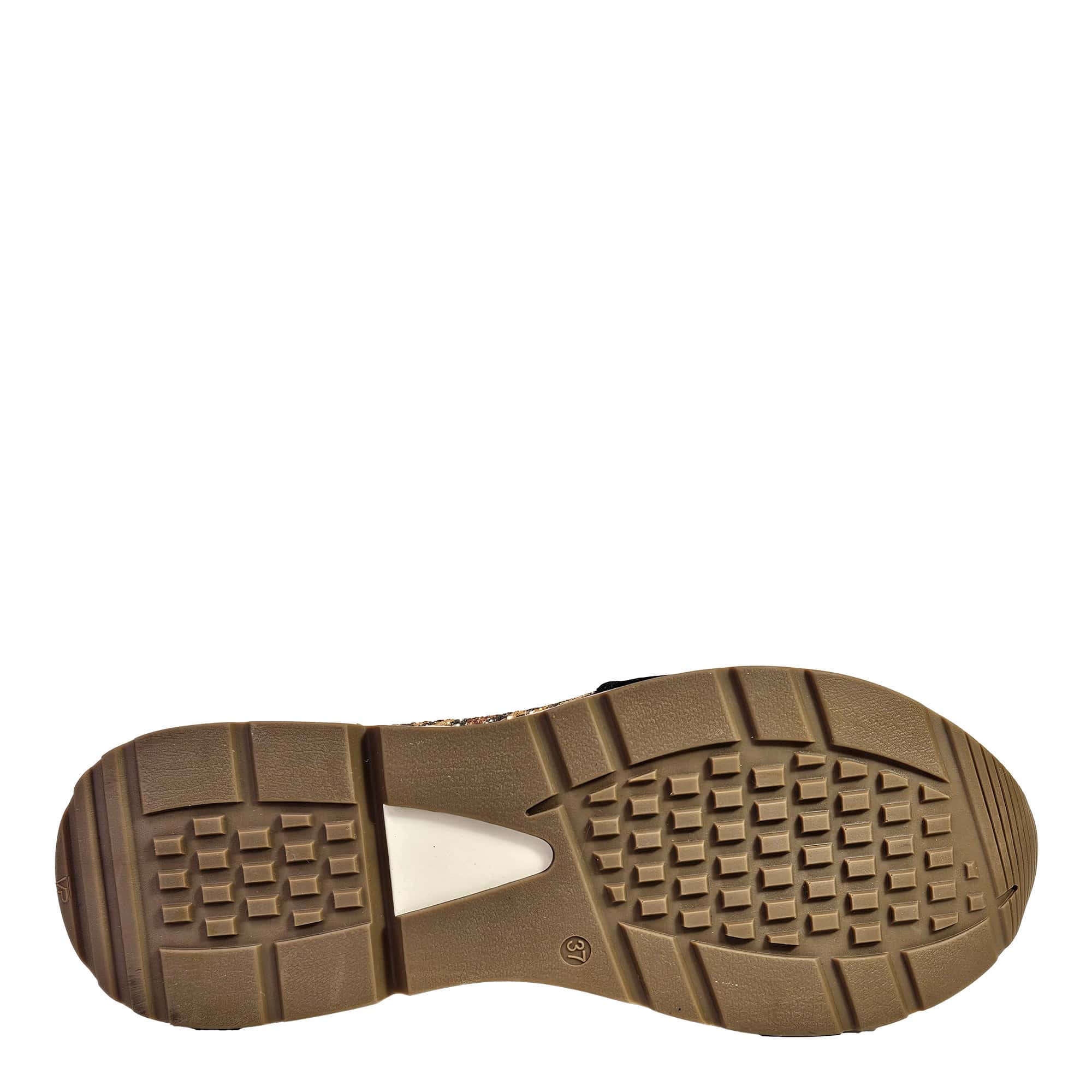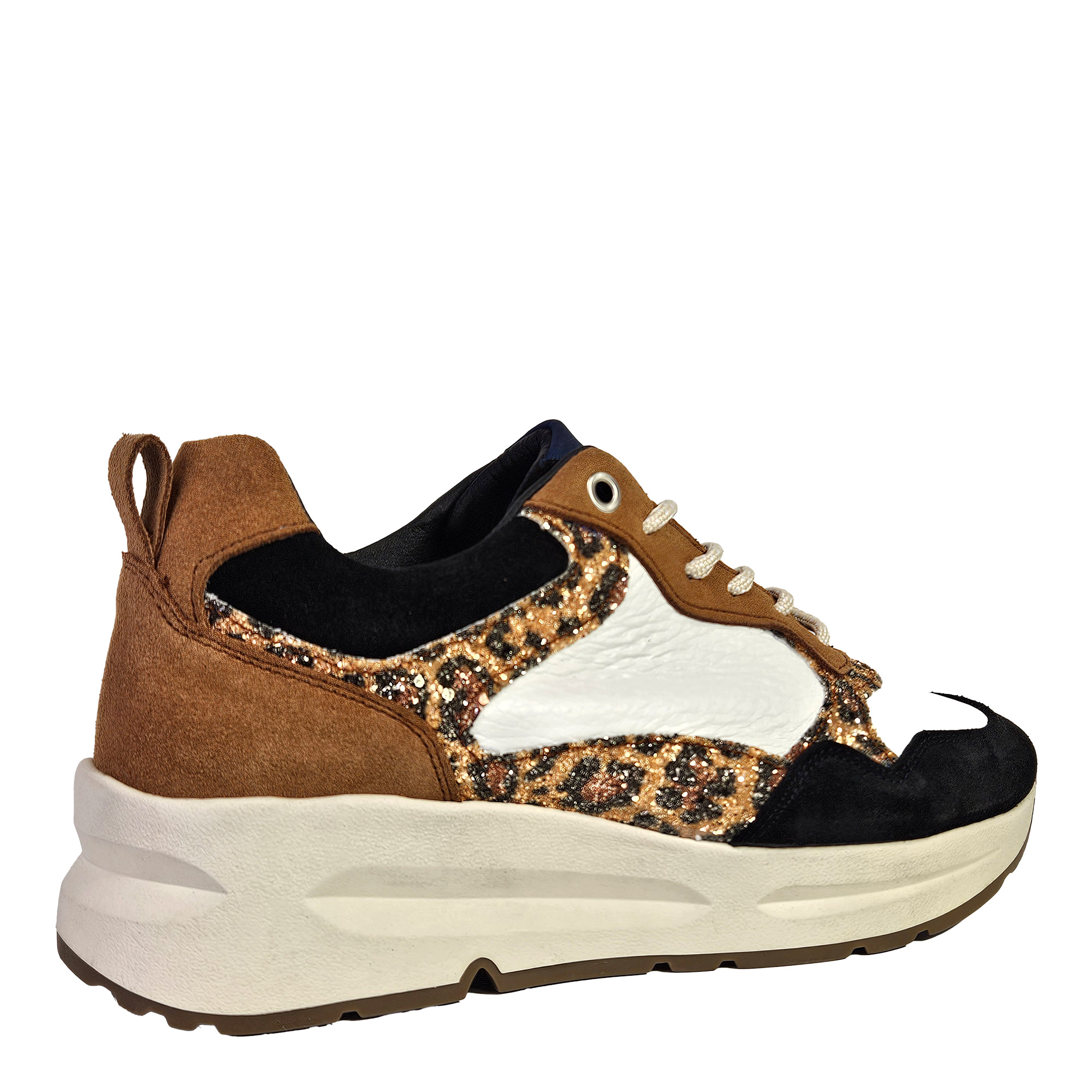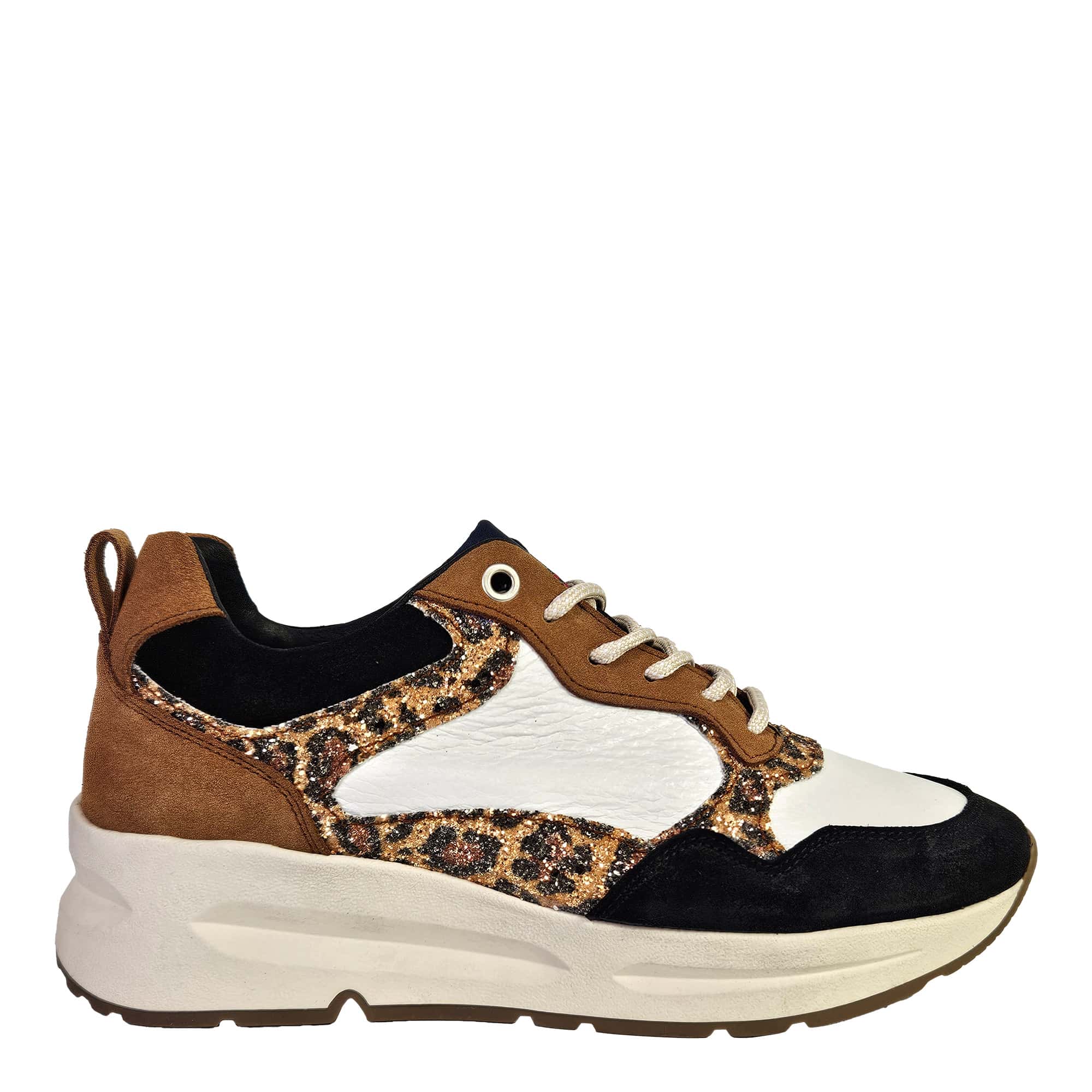 Sneaker de mujer, fabricado con piel flor blanco y combinado de piel afelpado camel y negro con toques de color en tejido con animal print de leopardo. Forro en microfibra absrovente y transpirable de color negro. Plantilla extraible. Suela de caucho ligero en color crudo con parte de abajo en tono marrón claro.