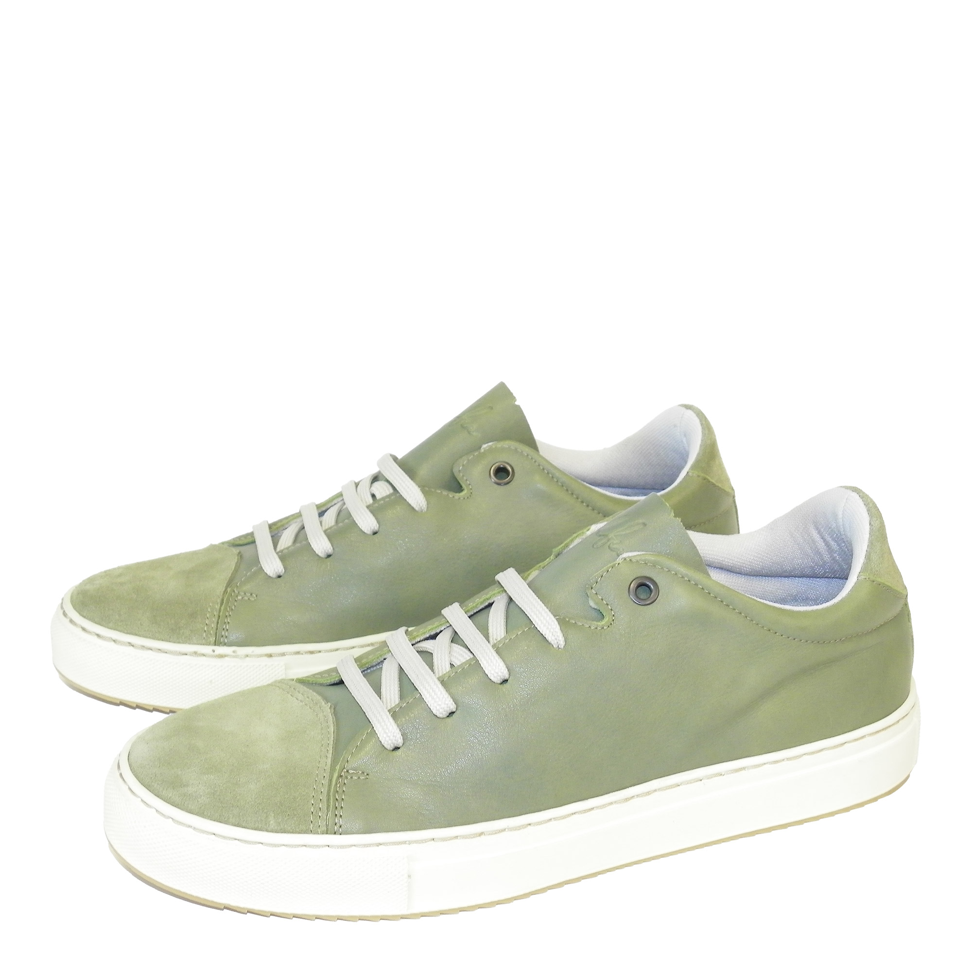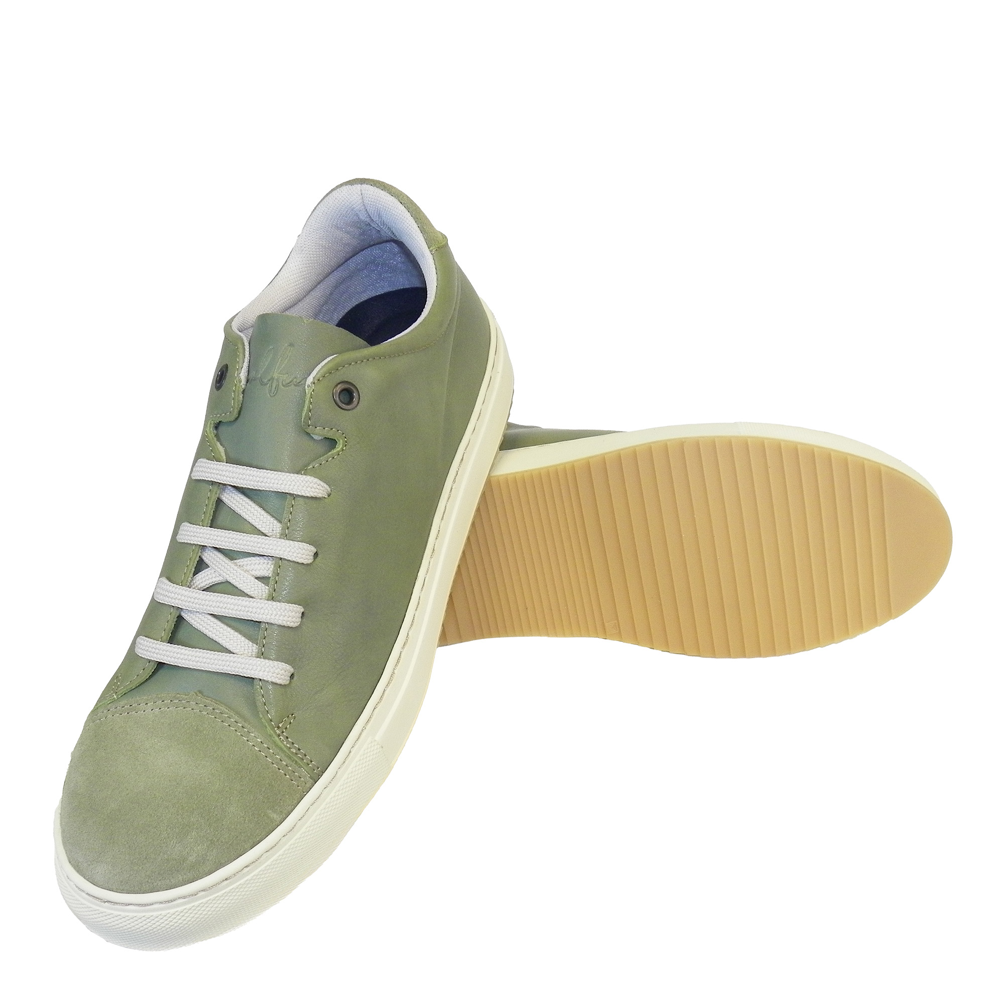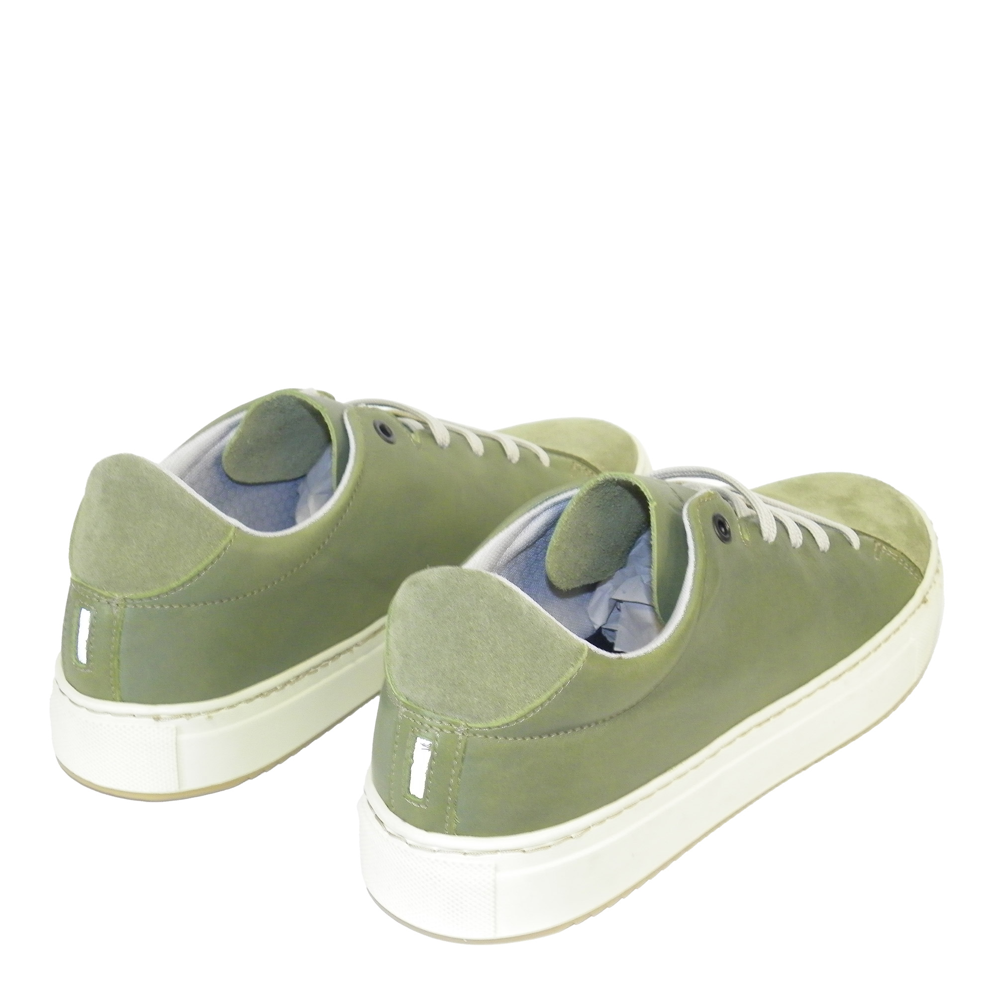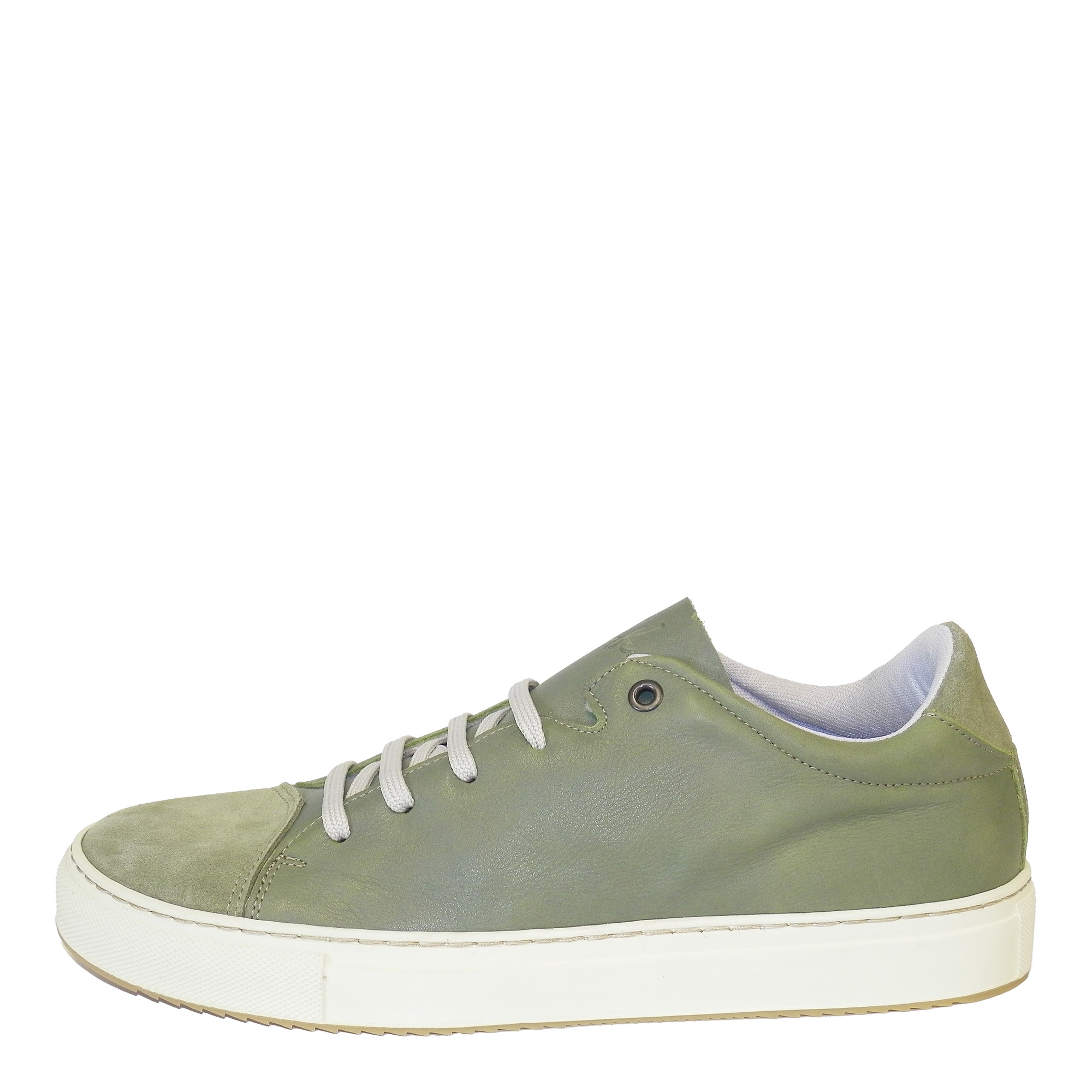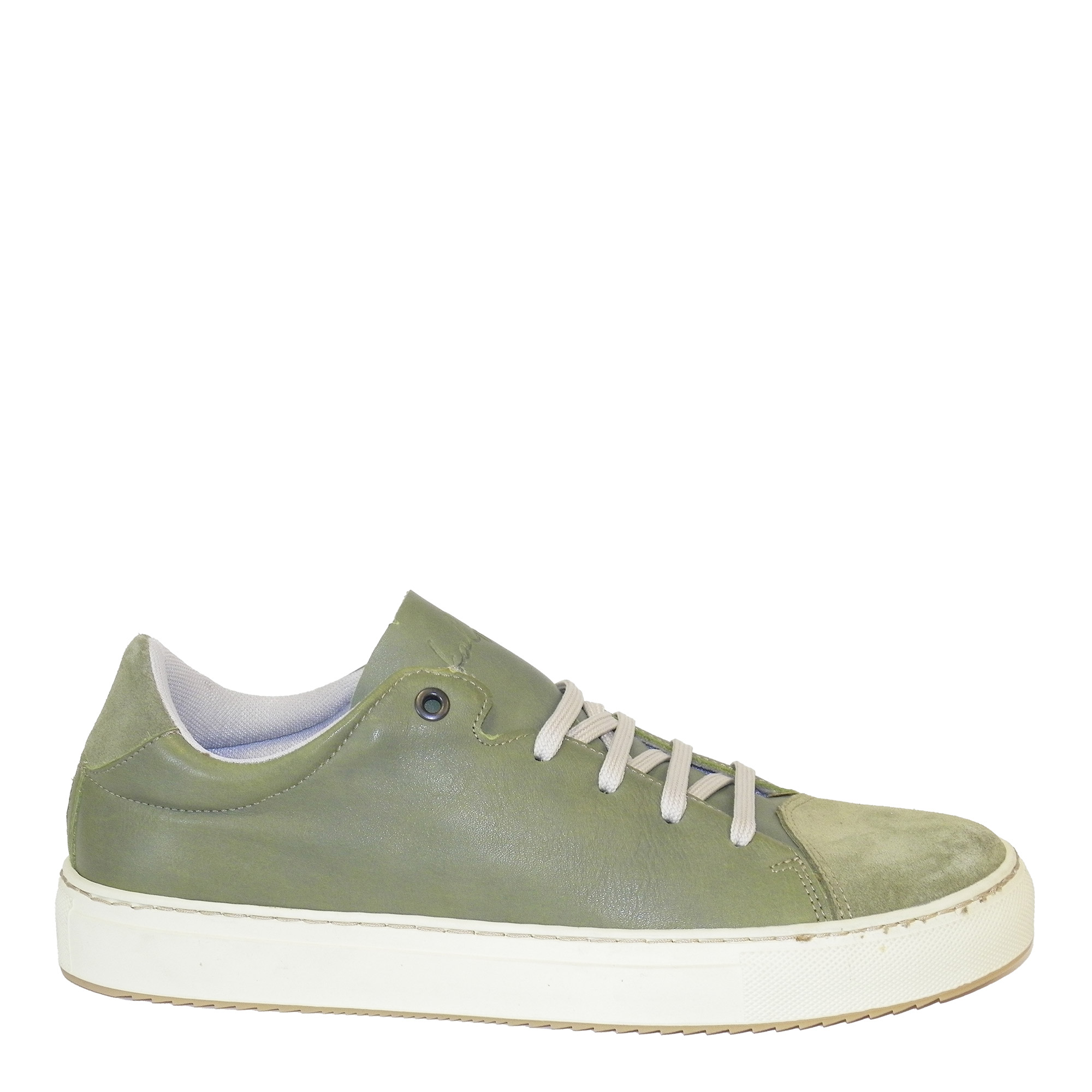 Sneaker, fabricado con una combinación de pieles, en los laterales una napa suave color kaki y en la puntera y talón afelpado con acabado irregular. Color kaki. El forro es de tejido rejilla muy traspirable color claro. La suela es tipo casco pegada y cosida en goma de primera calidad, color beig claro en el lateral y color marrón claro en la parte de abajo.