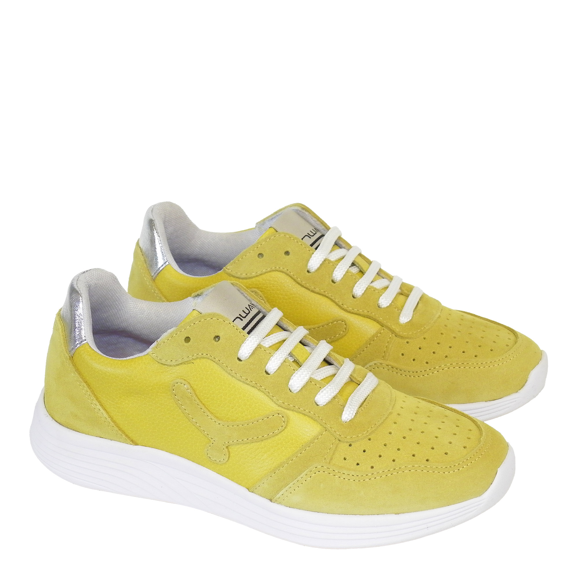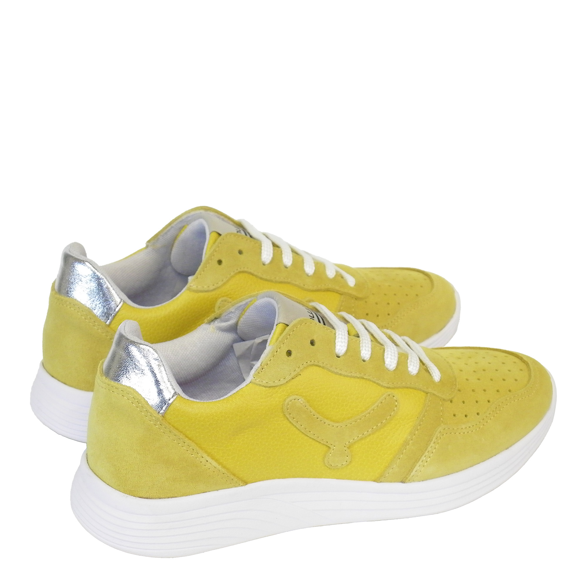 Sneaker de mujer, fabricado en piel grabada de color amarilla, combinado de piel afelpado de color amarilla, y la parte del cuello en piel color plata. Forro en rejilla tranpirable y resistente a la abrasión del pie de color gris claro. Plantilla extraible. Suela de eva ligera en color blanco con insertos en goma que garantizan el agarre a la superficie de color negro.