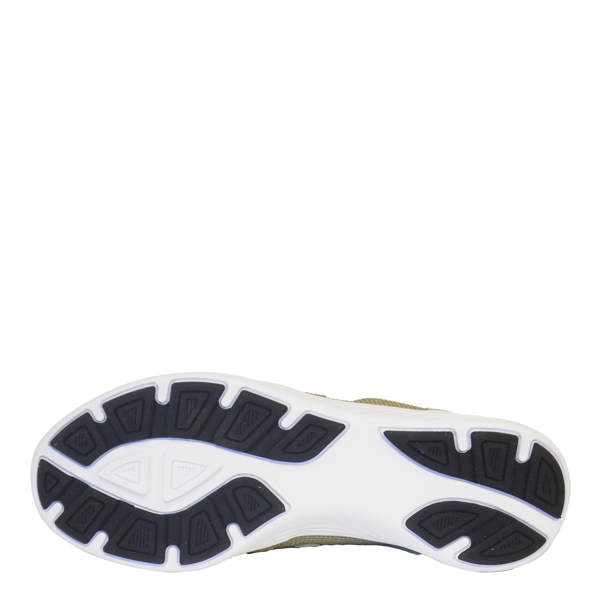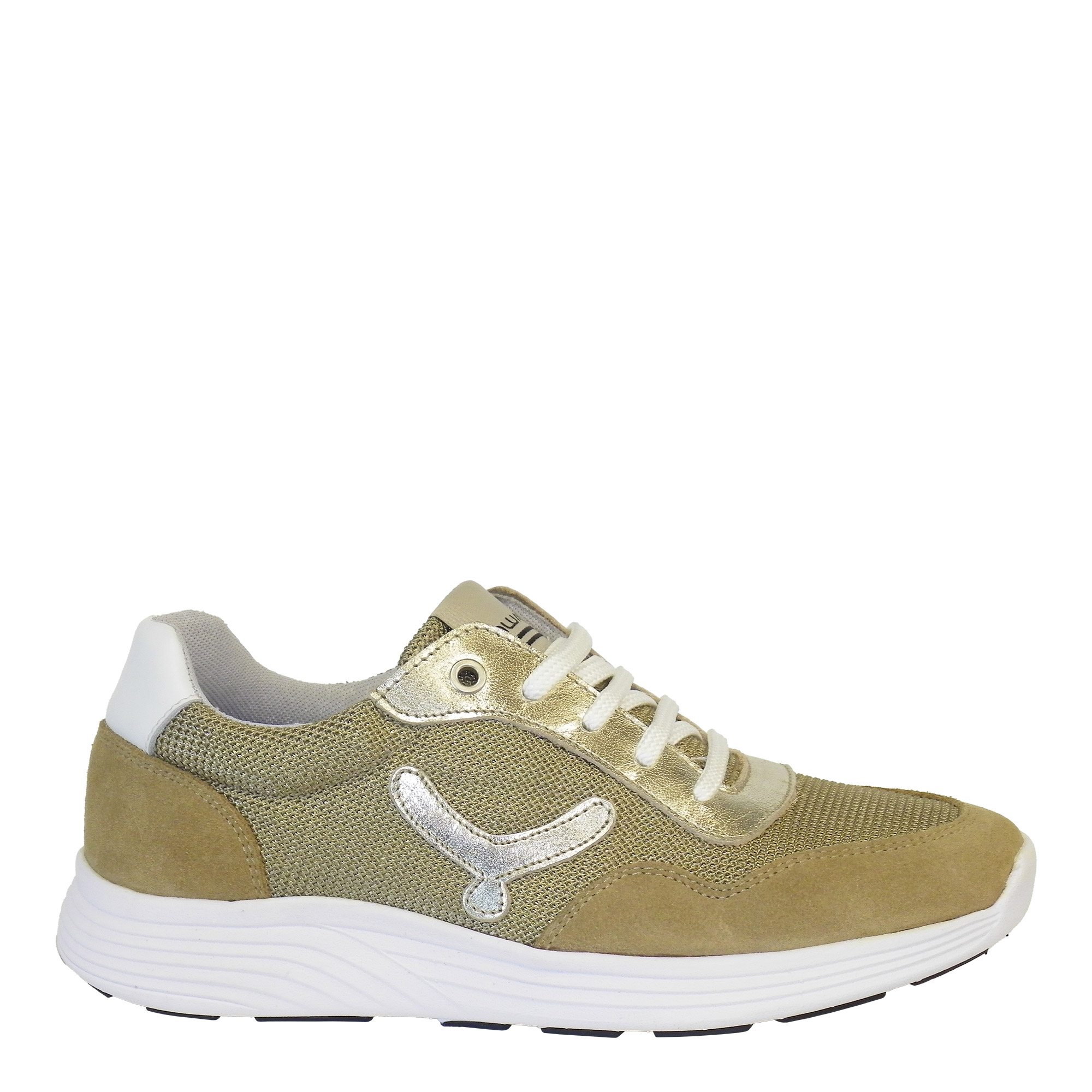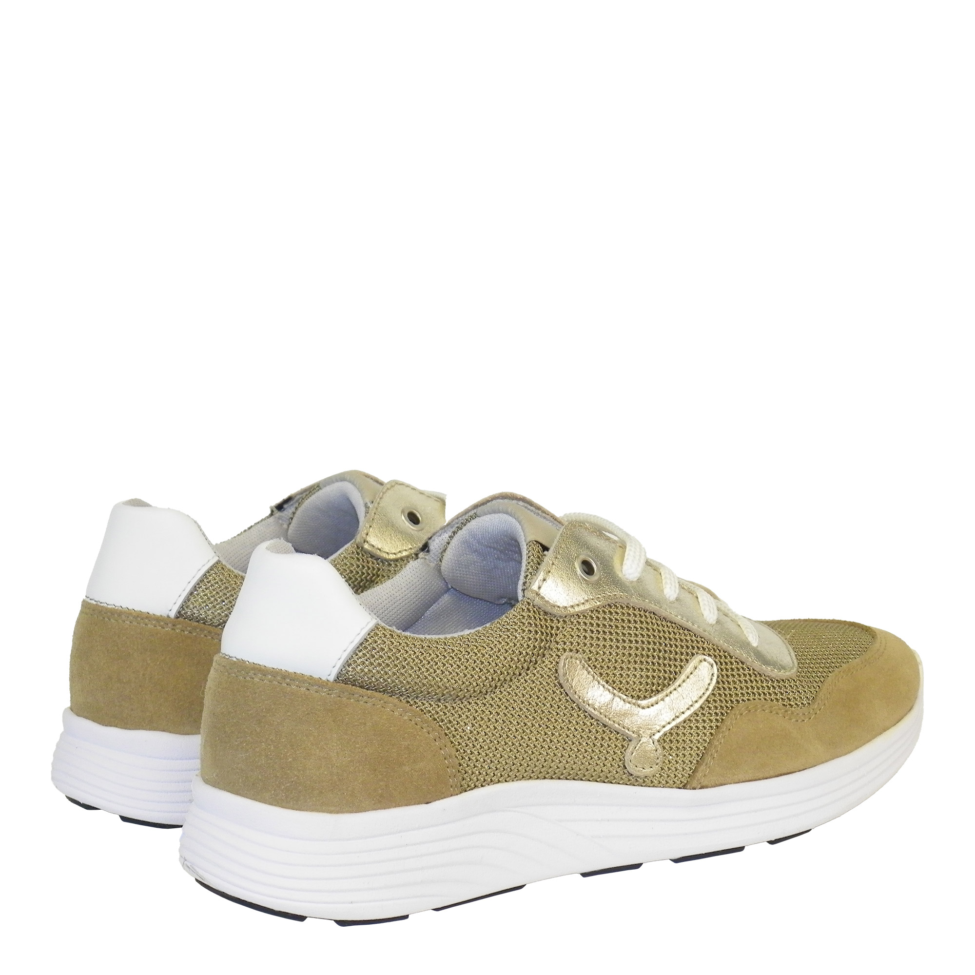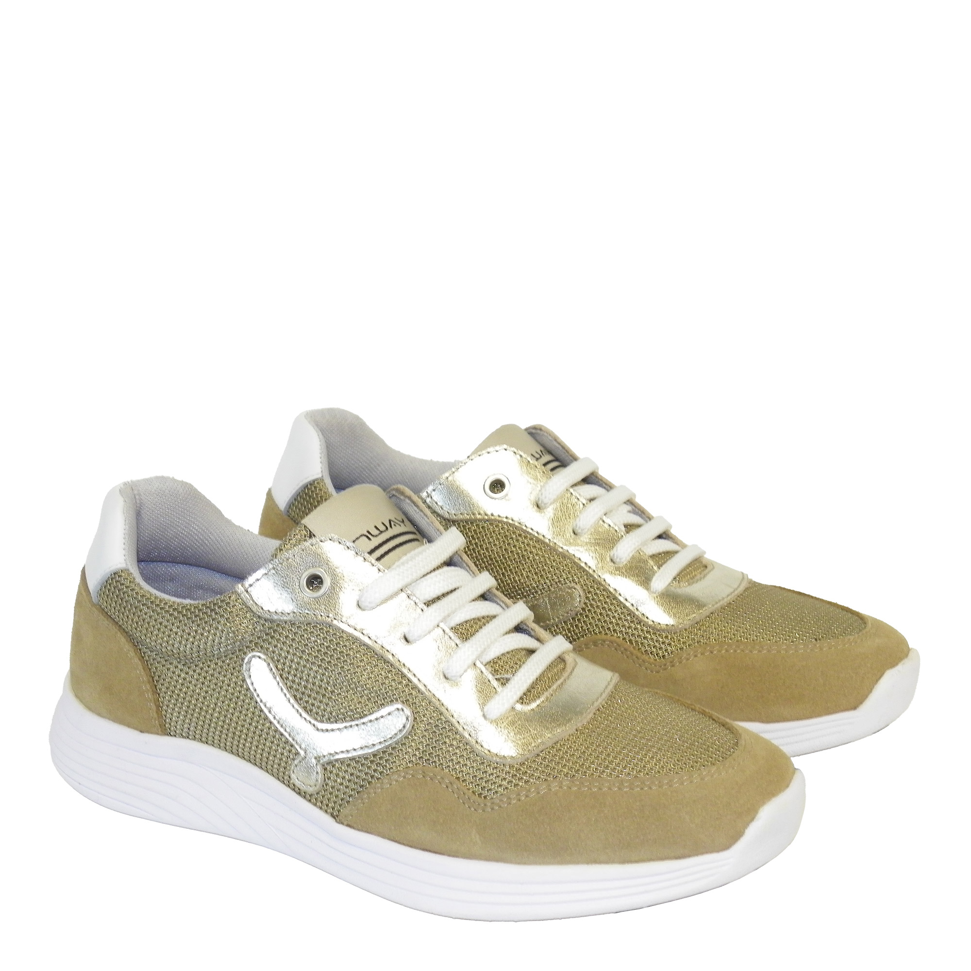Sneaker de mujer, fabricado con tejido tipo rejilla con efecto brillantina oro, combinado de piel afelpado de color arena y adornos de piel metalizado oro. Forro en rejilla tranpirable y resistente a la abrasión del pie de color gris claro. Plantilla extraible. Suela de eva ligera en color blanco con insertos en goma que garantizan el agarre a la superficie de color negro.