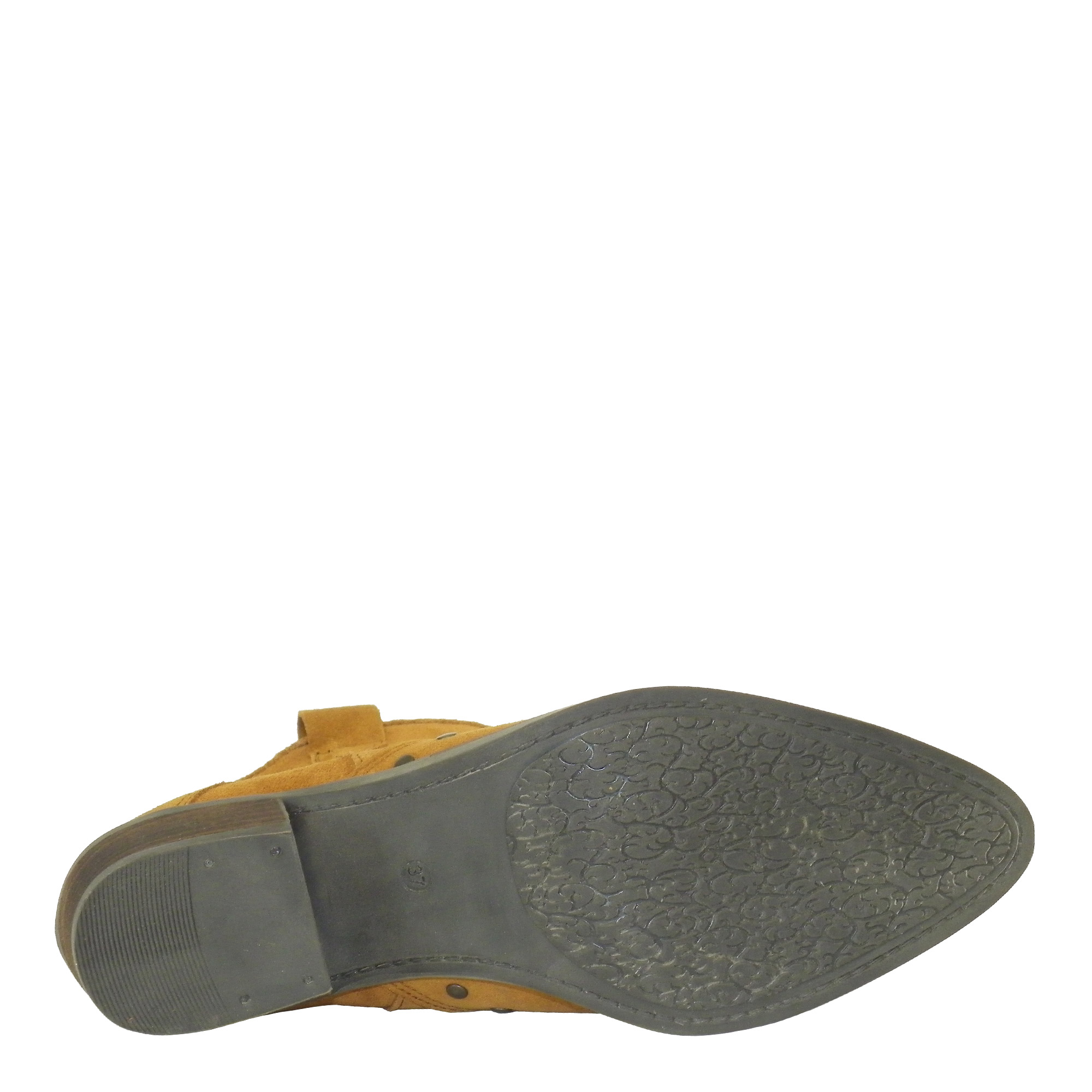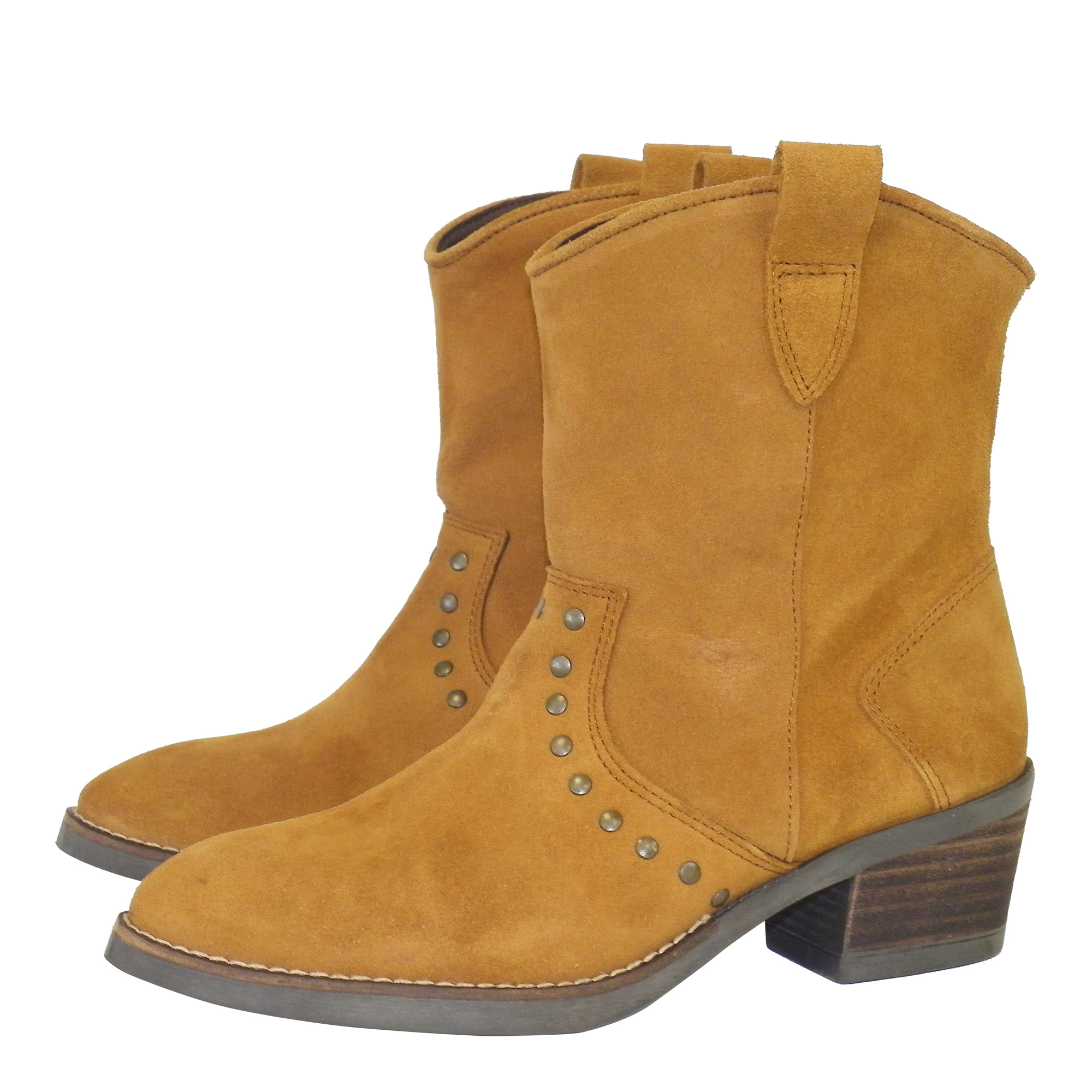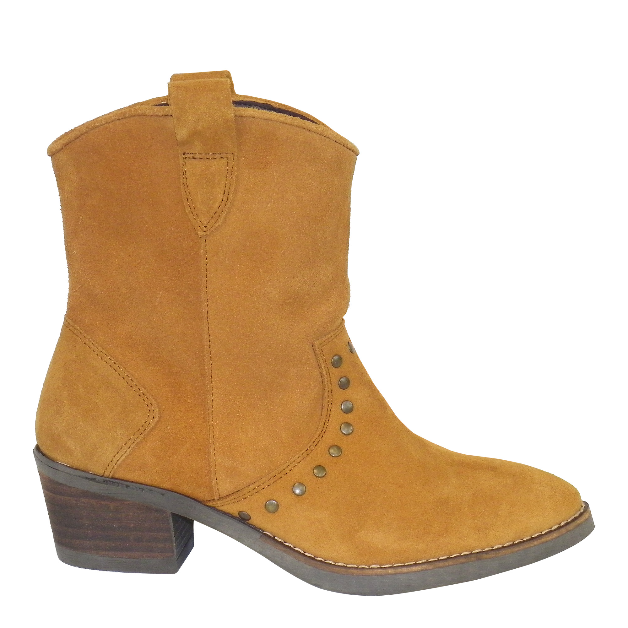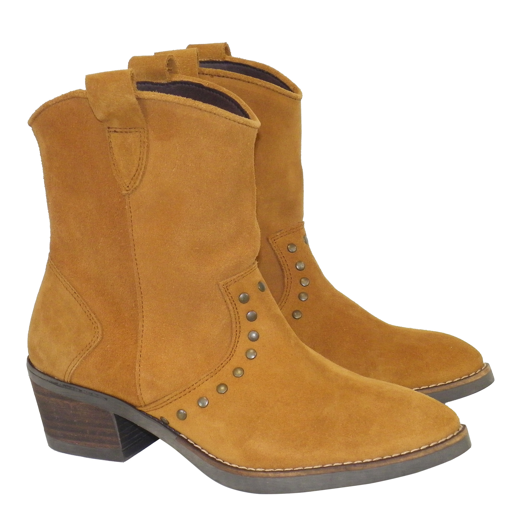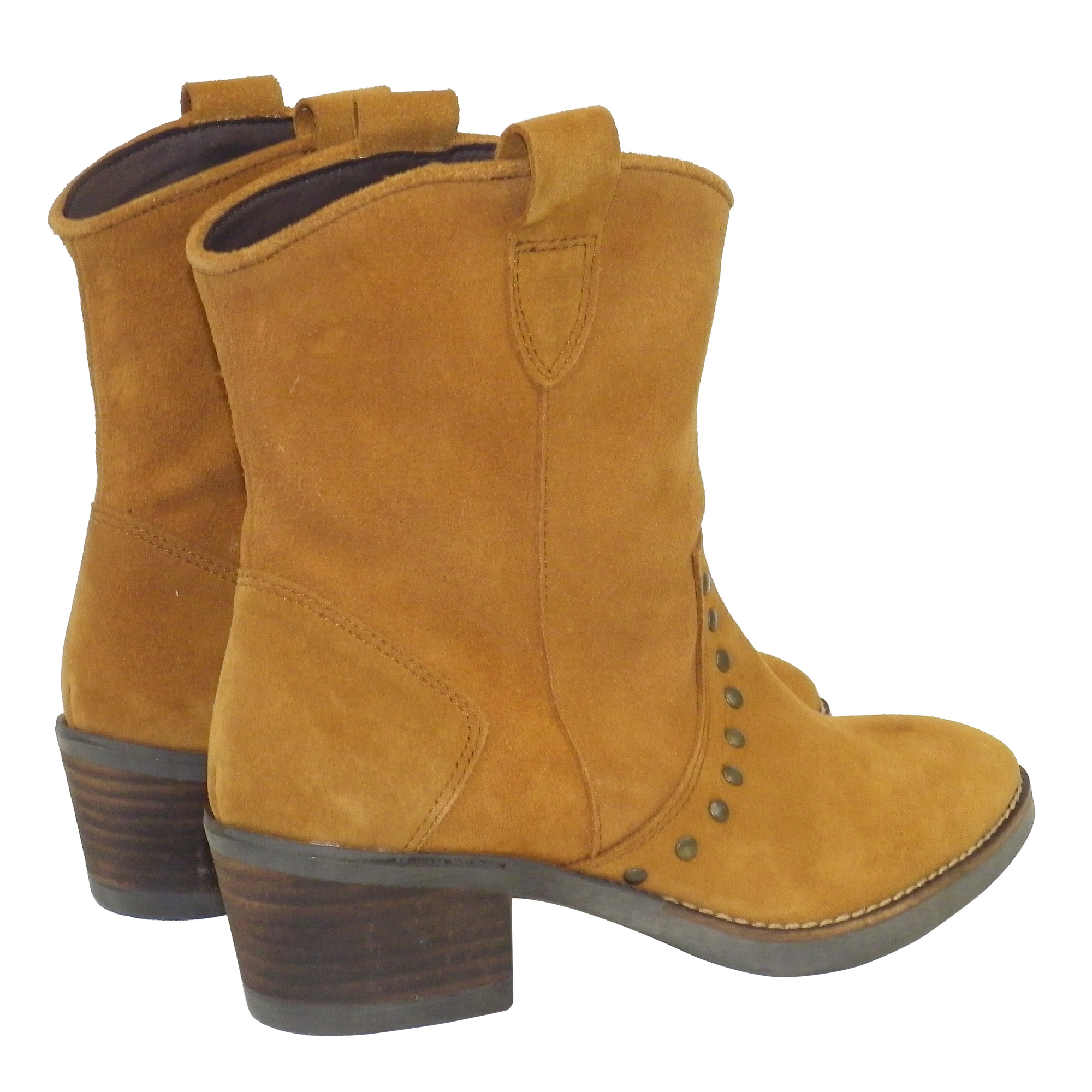Botín de mujer fabricado en piel afelpado de color cuero. Forrada en microfibra absorbente y transpirable con gran resistencia a la abrasión en la parte del talón y del empeine de la bota en tejido. Plantilla interior de la misma microfibra y acolchada con espuma de 2 mm. Adornos metalicos en la zona del empeine color oxido. Piso en caucho de color marron con la zona del tacón similando madera.